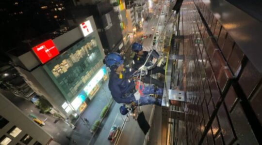 東京都渋谷区にて無足場工法であるロープアクセスによる懸垂幕(看板フレーム)の撤去工事を行いました。看板フレームが設置している場所は、屋上付近のことが多く足場を建てると非常にコストが高くなります。