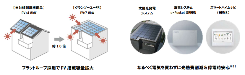 積水化学工業株式会社 住宅カンパニーさんがリリースした木質系戸建住宅「グランツーユーFR」は屋根が水平なタイプで太陽光パネルの設置面積を広くとることができる面白いデザインです。