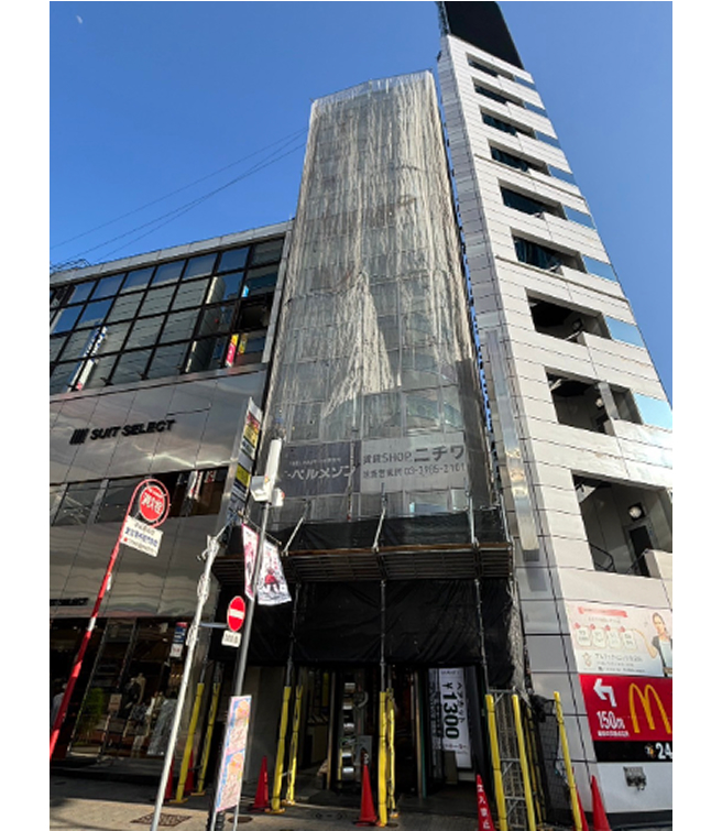 正面以外は足場を建てられないほど狭く、また全面的にロープによる工事を行った方が安価になりましたが、歩行者の往来が非常に多いエリアであった為、1F部分だけ敢えて足場を建て、落下防止措置をとって小さなゴミも落ちない状況を作って外壁塗装とシーリング工事をさせて頂きました。