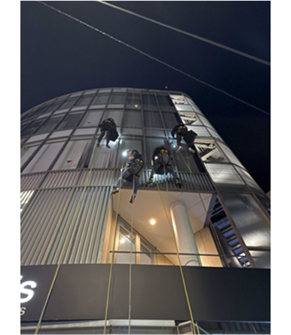 漏水に悩れていた建物で、日中はビジネスマンの往来が多いエリアでしたが夜間は人通りが非常に少なかったので、ロープ作業だけで夜間に行いました。