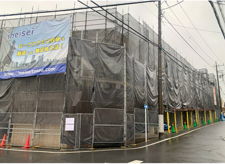 低層のビルやマンションの場合は、工事内容によっては足場を建てた方が最適になる場合があります。元々は全て足場を建てて工事を行う会社としてスタートをした経緯があり、その際には全面足場での工事も可能です。