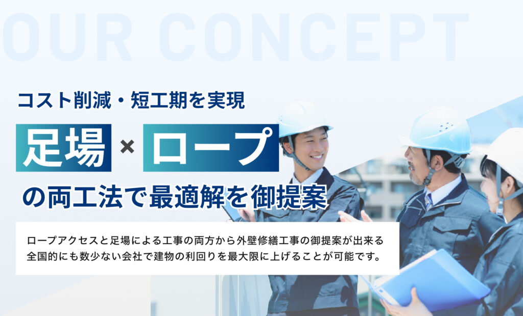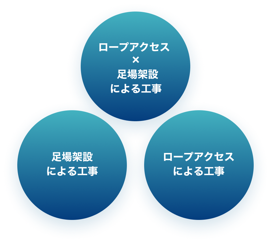 RITAでは、通常の足場による工事とロープアクセスでの工事の両方を自社施工できる日本でも数少ない会社です