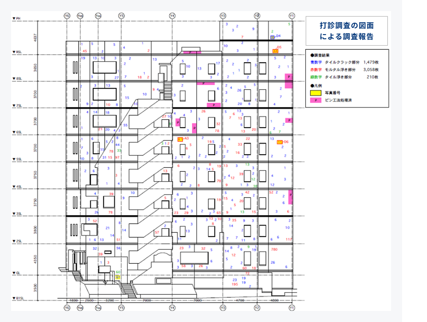 通常の大規模修繕工事を行う会社の場合、上層階の劣化枚数が分からない為、1Fの外壁部分だけ調査を行い、その結果を元に全体の外壁に対して同じ割合で概算の見積りを行うのが一般的ですが、建物の下と上では大幅に外壁タイルの浮きの状況が異なることも多く、足場を建てて修繕費用を請求することも多々あり、急遽の資金調達に苦労されるお客様を多く見てきましたが、弊社では事前にロープアクセスにより外壁タイル1枚1枚を丁寧に調査をするので、工事が始まってから追加の費用を心配する必要がありません。
